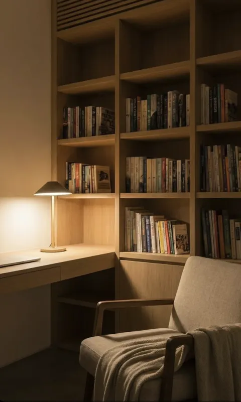 Cozy Study Room Interior Design with Open Shelves Bookcase